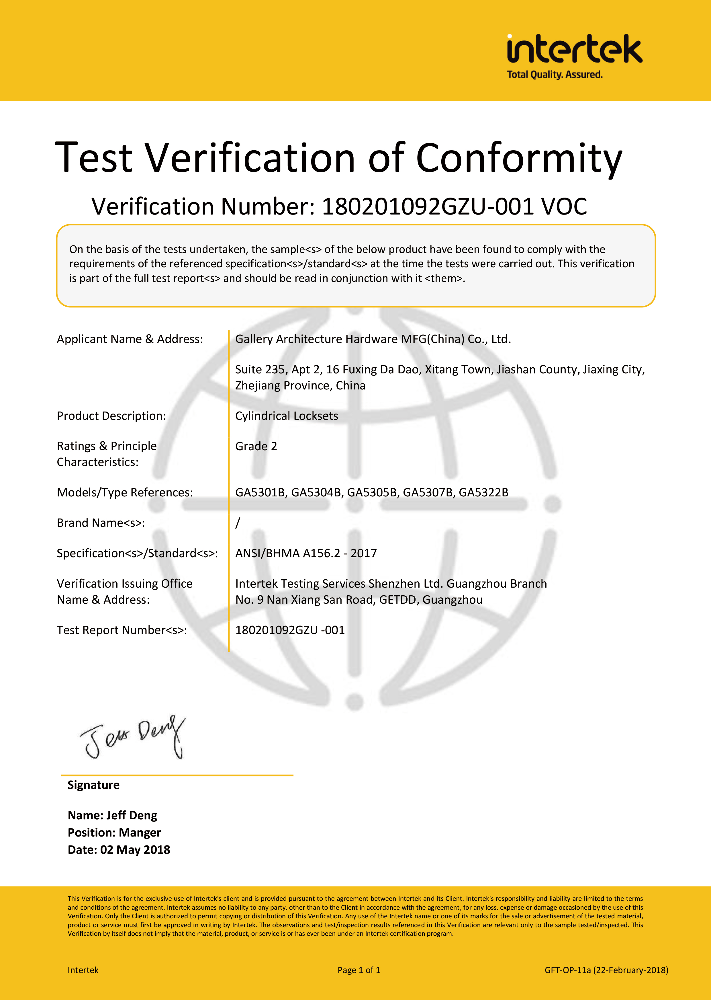 浙江堅迪五金制造有限公司始建于 1995 年。自 2003 開始,公司致力于高標準商業(yè)鎖的研發(fā)工作,并于 2006 及 2007 年,8700 插芯鎖系列獲得美國國家標準 ANSI A 156.13-2005 一級、ANSI A 156.2-2003 二級和美國 UL 10C3 小時防火測試認證。自 1998 年以來,公司不斷提升產品和客戶服務品質,并獲得了 ISO 9001 的認證。